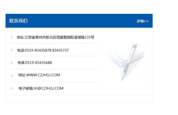 地址:常州市新北區友邦商務大廈1幢16、17層  電話:0519-85101652  傳真:0519-85112595  郵編:213022  網址:www_cz-jiayue_cn.ntdggy.com  郵箱:xiajifengaa@163.com